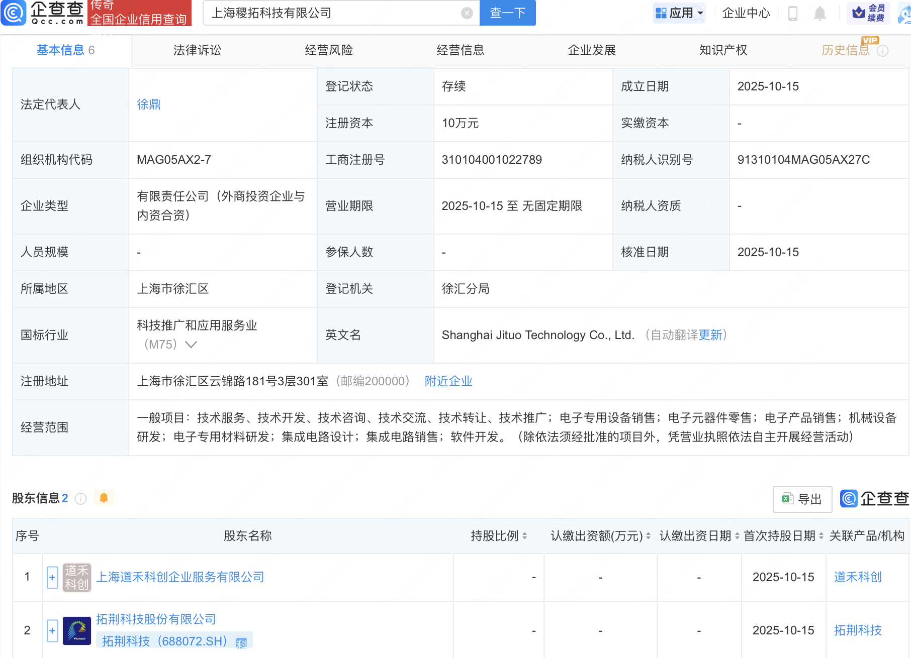 近日,上海稷拓科技有限公司成立,经营范围包含:电子专用材料研发;集成电路设计;集成电路销售;软件开发等。企查查股权穿透显示,该公司由拓荆科技(688072)等共同持股。